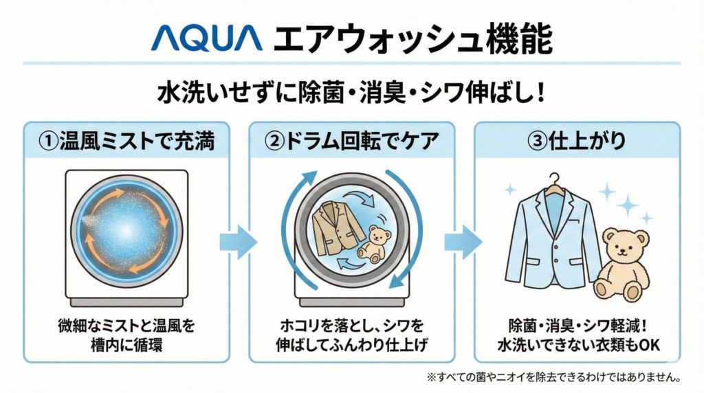 - エアウォッシュ機能が便利 水洗いできないスーツやぬいぐるみも、温風ミストで除菌・消臭できます。