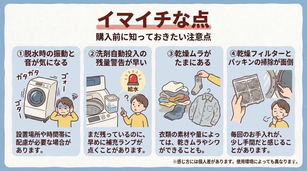 特に「自動投入」は神機能です。洗濯物を放り込んでスイッチを押すだけ。これだけで家事の負担が体感半分以下になりました。