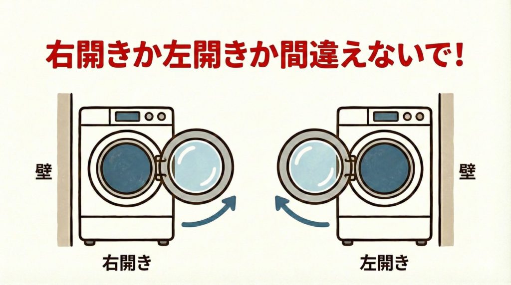 ドラム式は扉が前面に開くため、壁の位置に合わせて「右開き・左開き」を選ぶのが重要です。ここを間違えると毎日のストレスになるので要注意!