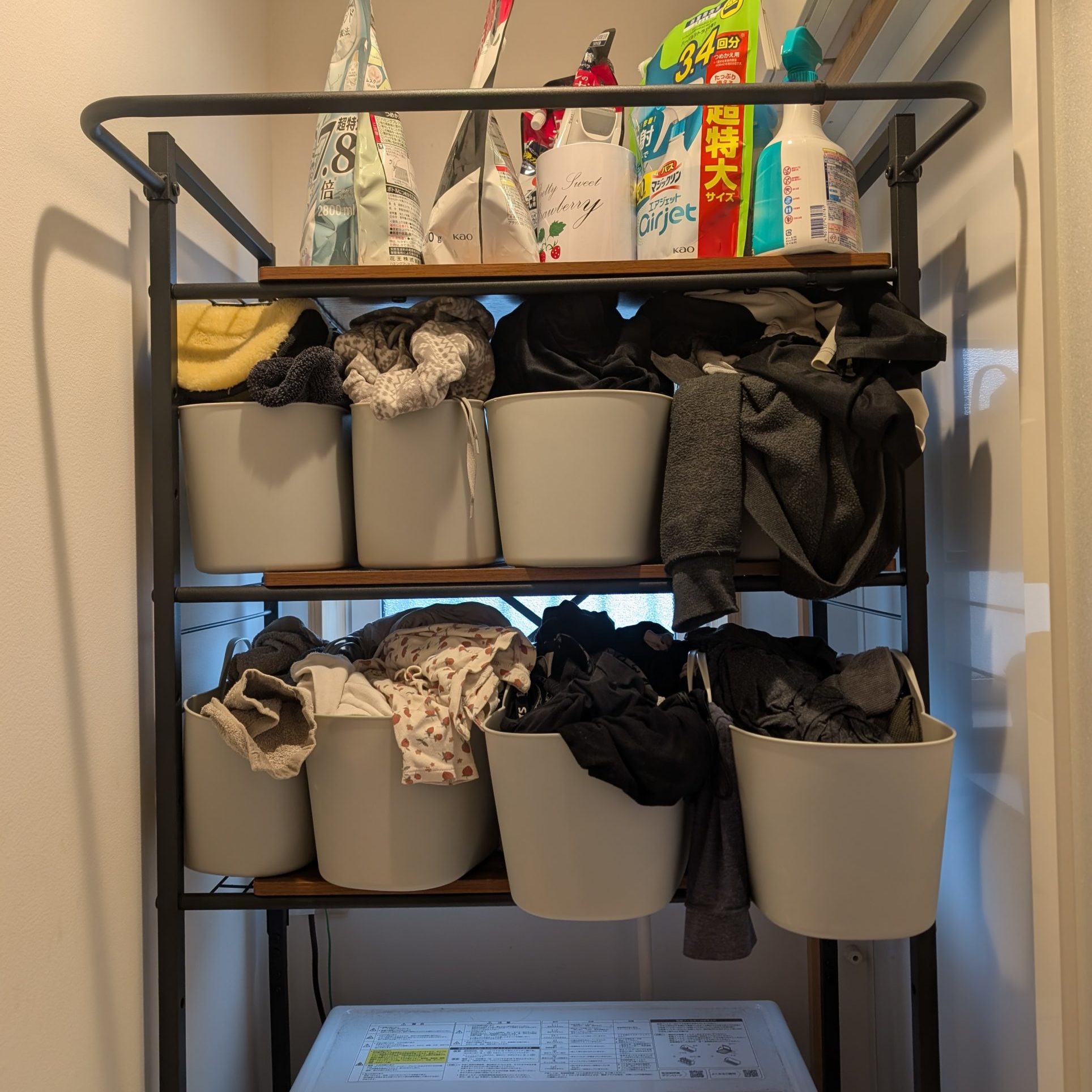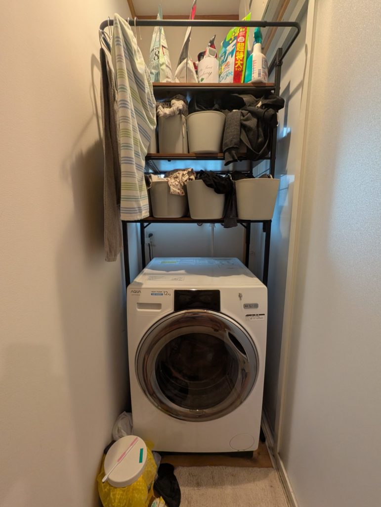 ドラム式洗濯機は別途必要ですが、収納システム自体は1万円ほどで構築できました。見た目にこだわらなければ更に安いラックもあります。