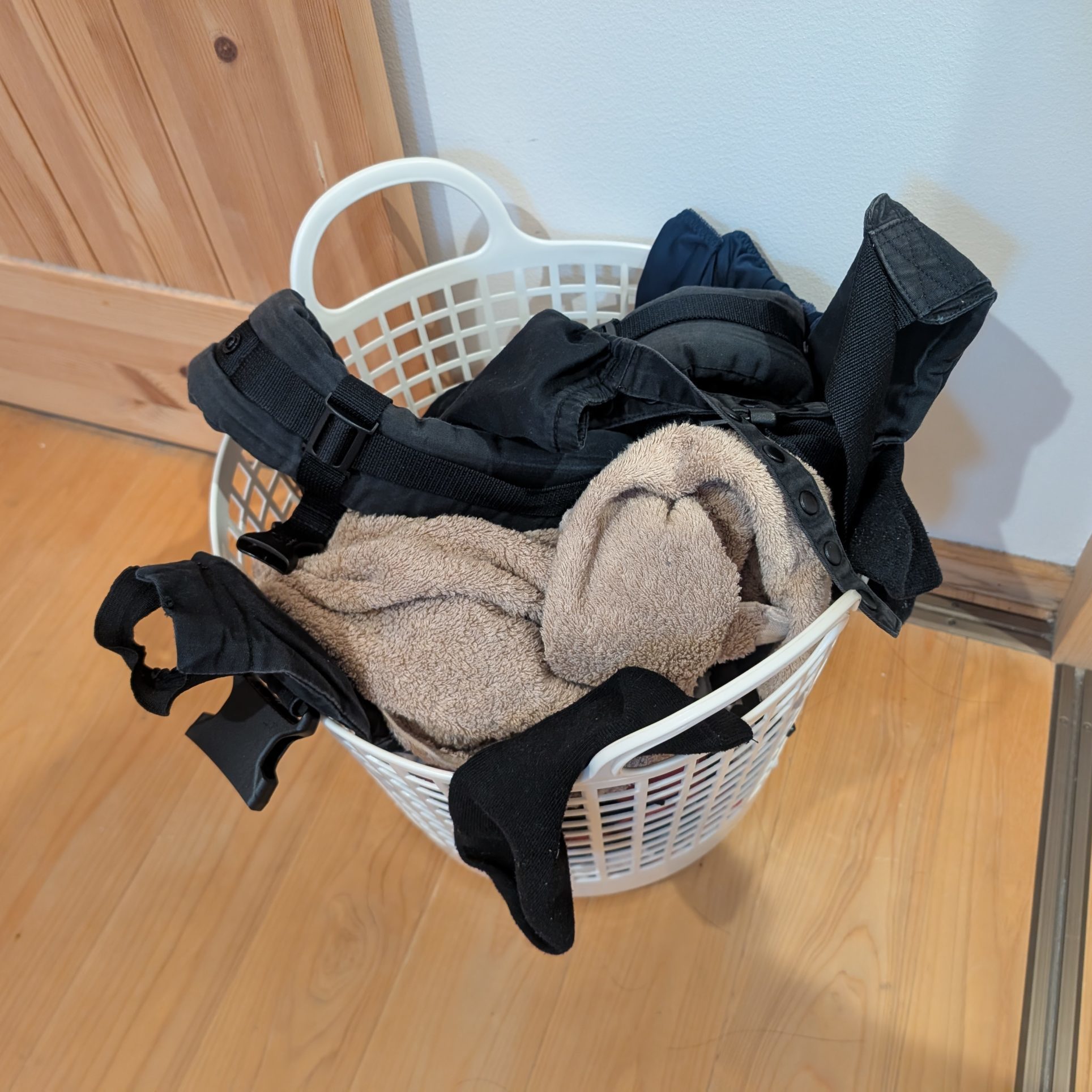 まず、ドラム式洗濯機から出した洗濯物は、この白いカゴに一時保管。ここがポイントで、すぐに片付けようとしないこと。子どもの世話で手が離せない時も、とりあえずカゴに入れておけば次の洗濯も回せます。
